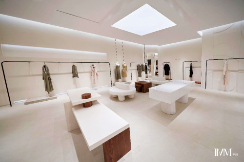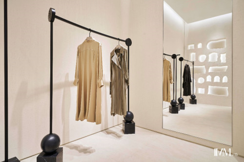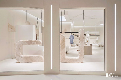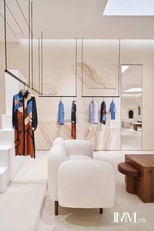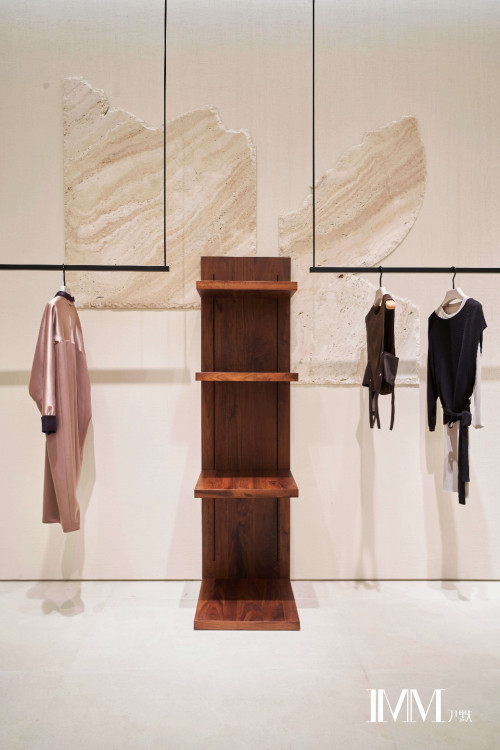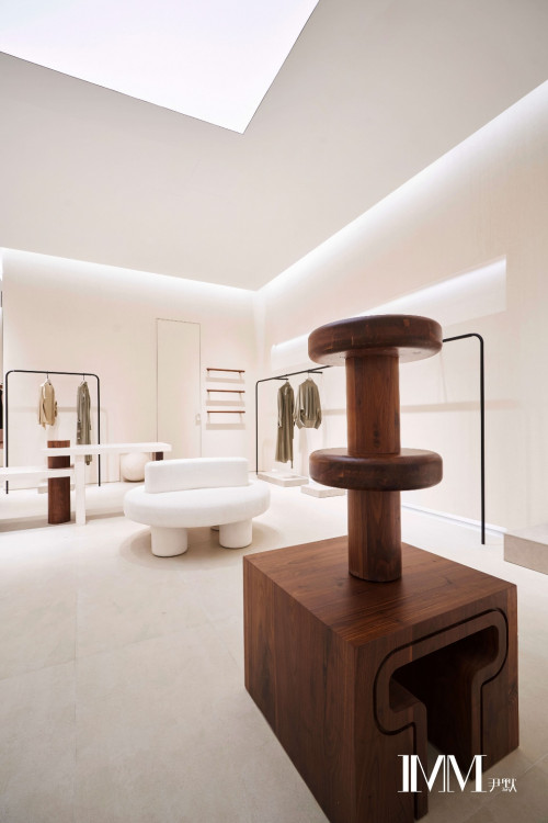 “IMM GALLERY” 由视觉艺术家叶子乐设计。灵感源自爱琴海边悬崖上的安坡里奥村落,当地为了抵抗海上狂风,将弯曲延绵的墙面相连,以柔克刚,其建筑特点与IMM尹默独立、知性、艺术的品牌精神不谋而合,用自然的力量,诠释自然的艺术。