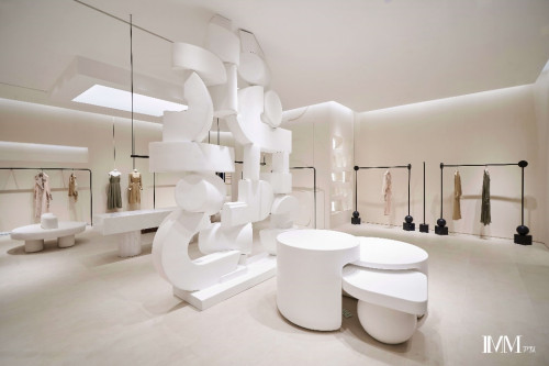 如暖白色美术馆般的“IMM GALLERY”成为空间主基调。中国意境和西方结构融会贯通,将安坡里奥建筑形式与“尹”字甲骨文的抽象笔画结合,化身装置雕塑立于空间中心,成为点睛之笔。