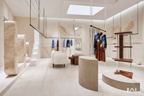 爱琴海风格的装饰墙搭配自然纹理的罗马洞石,带来碰撞感的力量之美。天然大理石的方圆型挂衣杆,圆形装饰面阴刻的甲骨文LOGO,圆形沙发和方圆结构的胡桃木茶几,以及白玉展台等设计皆诠释崇尚自然的新美学。