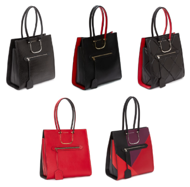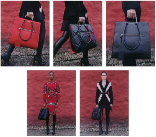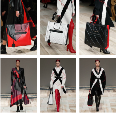 The Tall Story手袋推出黑色款式,对比感的红色内衬配以通过加热成型的全新大绗缝设计;以及黑色压纹鳄鱼皮革款式、成衣灵感的手工拼布图案款式。