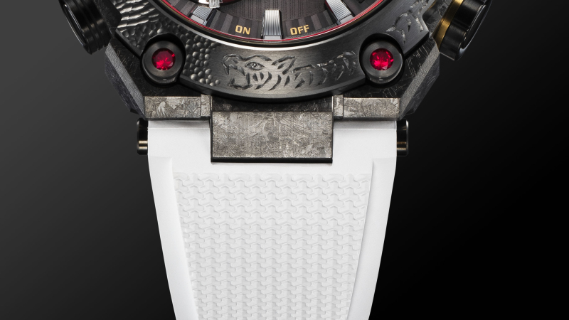 G-SHOCK此次选择以老虎作为兜盔前立的徽饰主题,用以表现强悍气场。为了呼应这一主题,G-SHOCK还邀请小林正雄在腕表表圈上也呈现了这一凶猛霸气的老虎图腾。运用精湛超群的纂刻技艺,并在完成雕刻后采用手工涂饰,使得每款腕表都是独一无二的存在。而且,腕表还特别在表圈上镶嵌了4颗人造红宝石,象征G-SHOCK充满激情的40年。