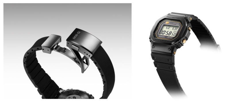 但不同的是,MRG-B5000R-1的Dura Soft表带特别采用氟橡胶制成,这种柔软舒适的材质具有强大的防变色、防污和抗老化性能。而且,内嵌成型的钛合金组件增强了表带与表壳的连接,三折式表扣也易于安装和拆除,全方面提升了腕表佩戴的舒适体验。