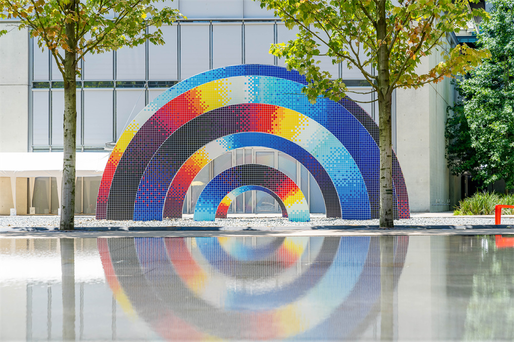 江南布衣特别邀请西班牙当代艺术家Felipe Pantone,为秀场打造了巨型艺术装置——《多维色彩动力学》(Chromadynamica Dimensional) 。Felipe Pantone受当代数字社会的速度与美学的启发,结合几何形状、像素化等数字化视觉美学,恢复数字时代下所生成图像的触觉价值。他本次创作的大型互动公共装置以构成“无限”的圆为灵感,采用多种耐用材料,呈现出精致工艺和现代感,结合此次江南布衣三十周年“生于独到,立于多元”的主题,Felipe Pantone通过色彩渐变的位移创造出丰富的感官体验,让色彩自由碰撞,敞开未来的无限可能性,更通过观众的互动参与,增强了艺术与公众之间的联结。