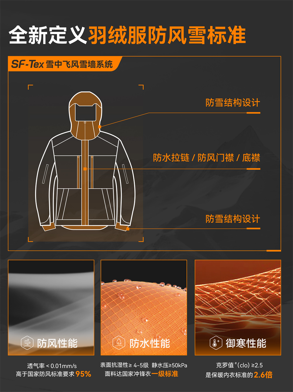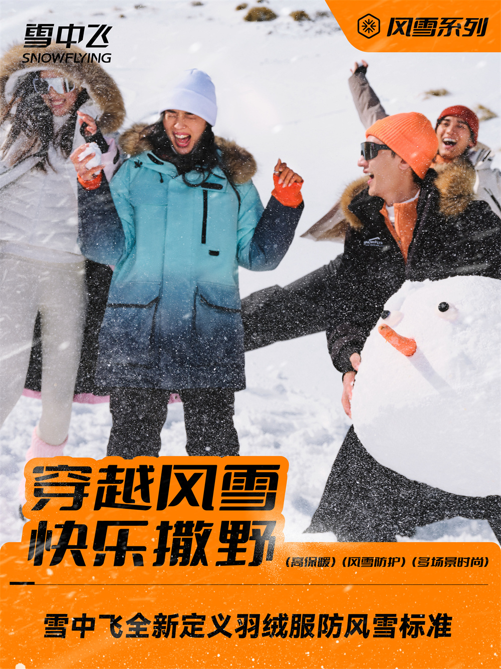 雪中飞重新定义羽绒服的“防风雪”标准,凭借其高功能价值崭露头角、不仅仅注重行业普遍实施的三防功能,还通过与广检携手引入创新的“防风雪”标准,打造出全新的风雪墙系统结构,实现防风、防水、保温、远红外发热和防风雪保暖等多项功能,每一款防风雪羽绒服都经过环境仓验证和真人实测,确保防风保暖性能卓越,安心过冬,无惧严寒。这些创新使得雪中飞的外套不仅能够让穿着者轻松应对多变的冬季户外环境,也能满足日常都市生活中的时尚需求,享受冬日的无限乐趣。
