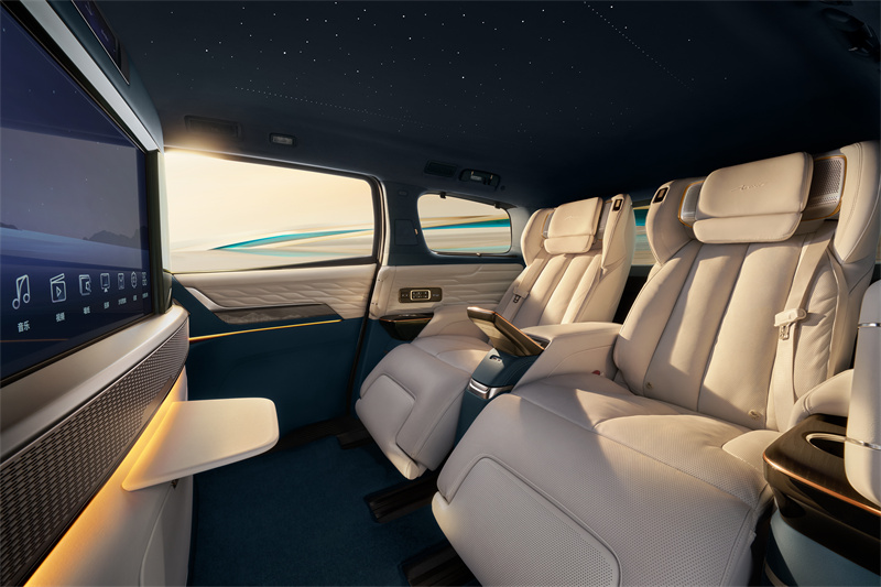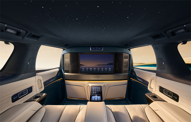 图:流光星瀚穹顶营造超越想象的浪漫情境 四座私享版还带来在顶级豪车中也非常罕见的流光星瀚穹顶,提供八大星空模式选择,通过散布在麂皮顶衬上的528个明暗交替星点,模拟出璀璨逼真的星空效果。辅以山水鎏银真木饰件、麦穗纹绗缝纹理等专属内饰设计,通过“有温度”的科技以及手工限量定制,打造出安顿身心、滋养心灵的超然意境,尽显名仕风雅。