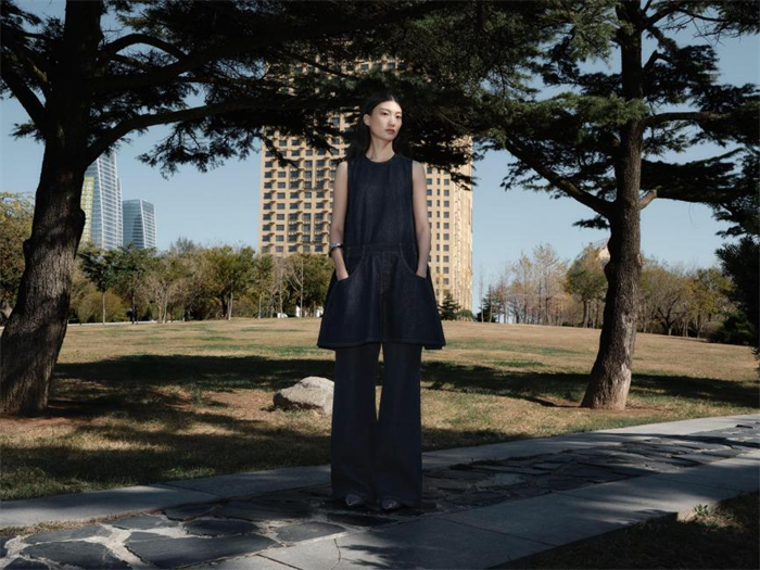 牛仔系列以全新姿态焕新,以创新面料与前沿工艺实现柔软重塑。深胚蓝牛仔马甲连衣裙,纱线经过筒子纱活性染色,染料中的活性基因与纱线发生反应形成牢固的共价键结合,色牢度更优于常规靛蓝染,使得面料颜色鲜艳明亮,再通过特殊水洗工艺,呈现自然落色效果,更具层次感。圆领无袖可连衣裙与宽松牛仔裤搭配,轻松舒适,点亮都市穿搭,打破传统牛仔的硬朗印象。