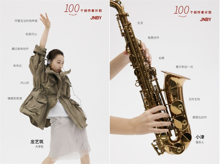 此次JNBY 再度启动「BE YOURSELF#100个创作者计划」新一季的企划,于3月发布9位来自社群的创作者海报,其身份涵盖作家、舞者、音乐人等多元属性,打破专业与素人界限,支持多元领域创作者的个体表达。