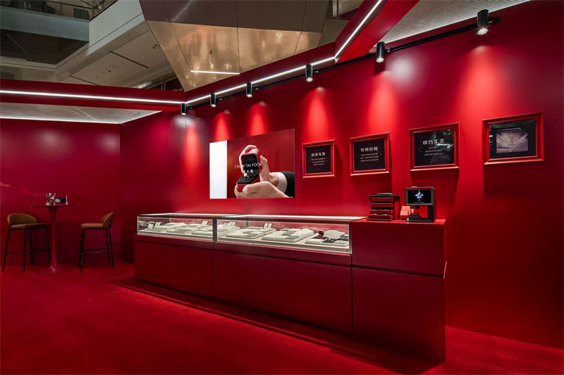 本次西安限时主题展延续深圳、武汉、大连的沉浸式策展思路,并融合古城千年文脉、新春喜庆氛围与天然钻石的璀璨光华,打造出融汇东方意境与现代美学的空间。设计灵感源自周大福经典红色首饰盒,将钻石切面线条转化为流动的光影脉络,既再现开启首饰盒的仪式瞬间,也通过光影的层叠交织,生动诠释“每一面 为光所映”的主题内涵。