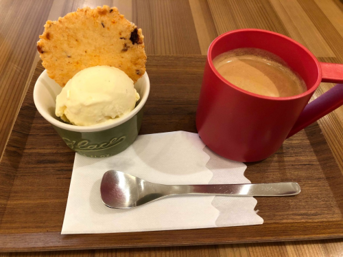 在这家咖啡厅,不能不试一下的是咖啡和MENBEI香草冰淇淋,在午餐的基础上只需再加150日元就能品尝到一份甜品。浓郁的香草味冰淇淋和香脆的MENBEI仙贝是什么神仙搭配,竟然好吃到停不下来,我们俩吃到没空搭理对方。