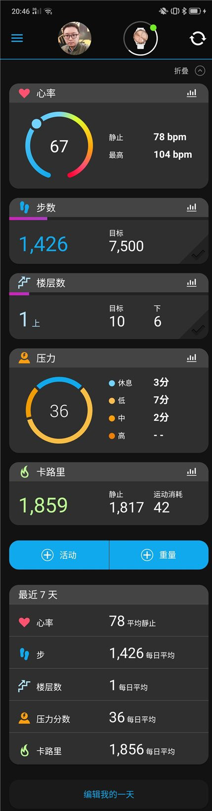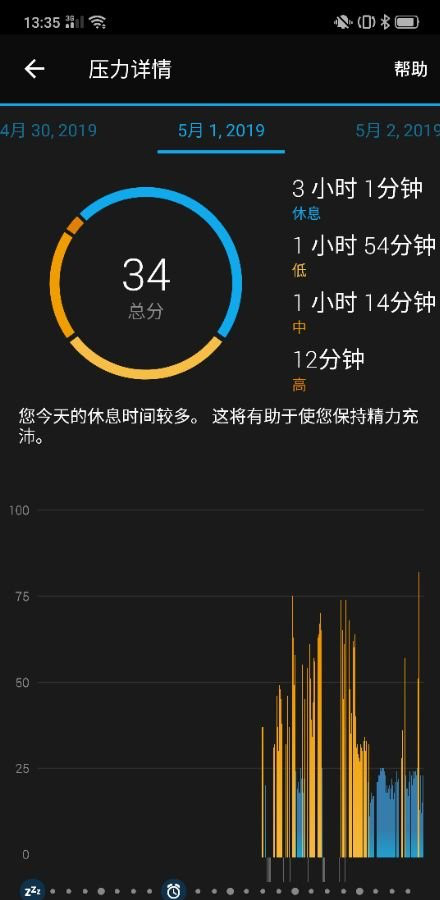 除了时尚静雅的外观设计和简约的风格之外,要衡量这款佳明vivomove HR女士时尚腕表的实用性还是要结合Garmin Connect Mobile App(以下简称手表App)来联动使用。vivomove HR女士时尚腕表的App之中涉及到了多个数据分析和记录项,常规的心率记录、卡路里消耗、计步数据、爬楼层数这几个选项是最常用的也是很常见的,比较直观的反应你一天的基本数据,这里比较让Cooper觉得更加有帮助的数据分析是“压力指数”。