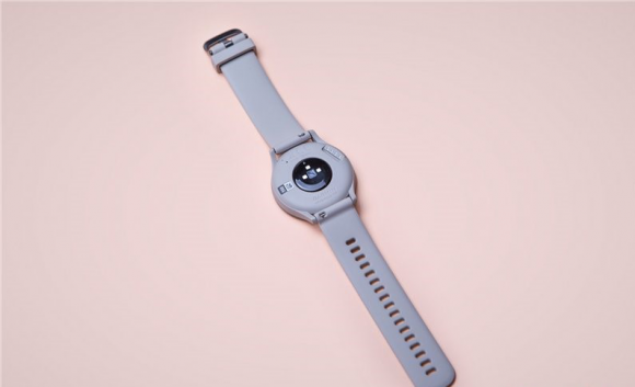 佳明vivomove HR背面,为塑料材质,颜色和表带统一,也是浅灰色,和深灰色金属表圈交相呼应,后部中心为感应装置,工作状态会发出绿色光,圆点接触面为充电口。佳明的vivomove HR女士时尚腕表没有表耳,佩戴也更加舒适,比如抬手或者腕部活动不会垫到手背,对时则需要连接手机App才能完成。这款黑色表盘深灰金属表圈的智能腕表更适合男士佩戴,热巴同款的玫瑰金等表款更适合女神们佩戴,总体外观还是比较时尚和静雅的。