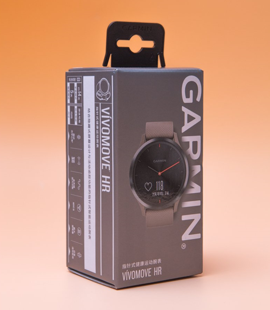 包装整体呈暗银灰色,表面也展示了佳明vivomove HR的表盘样子和点亮电子屏幕的效果。包装侧面主要列出了该款智能腕表的待机时长、防水等级、主要亮点功能等