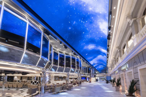 旗舰级设计:地中海荣耀号遵循当代欧式审美和造船工艺的最高标准,将现代设计美学的精髓融合在每一处匠心独的细节中。被誉为“海上香榭丽舍大道”的荣耀大道由长达80米的海上超长LED天幕覆盖。这块由1.4亿枚LED灯泡和1,450块LED屏幕打造出的天幕,每日上演昼夜不歇的海上天幕秀,带来美轮美奂的视觉盛宴。LED天幕超高的颜值和极强的延展性也成为企业个性化场景设计的不二之选,将为会奖团建活动提供更丰富多元的创新选择。跨越两层的荣耀大道两侧餐厅酒吧云集,购物名店环绕,白天是船上热闹非凡的社交中心,夜晚则可变身为派对现场,点燃海上奇幻之夜。与荣耀大道毗邻的闪耀中庭,由61,440颗施华洛世奇水晶铺就的楼梯环绕,灿若银河,美不胜收。