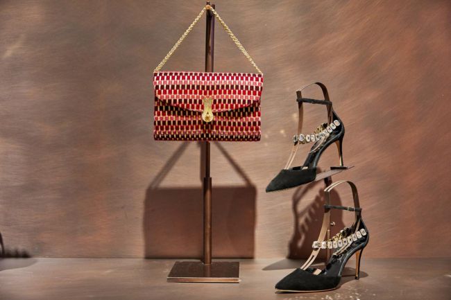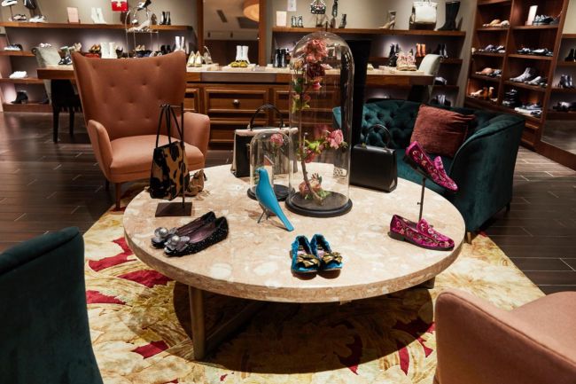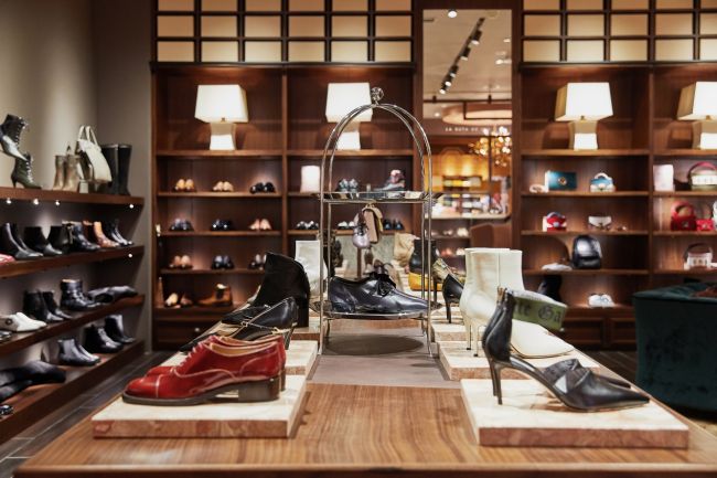 秉承店铺一贯的精美调性,以沉稳的胡桃色为基调,在暖黄的灯光下,大理石展示台上的鞋履与包袋摩登感十足,开业当日,吸引了大批消费者的青睐。