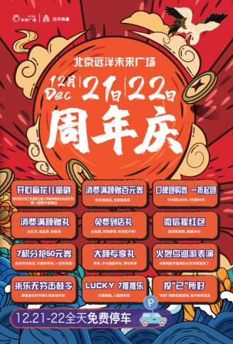 北京远洋未来广场12月21日—22日7周年庆,国潮来袭!各种有趣礼品互动,经典mix现代,别样周年庆购物体验就在12月21日—22日朝阳区北四环东路北京远洋未来广场。