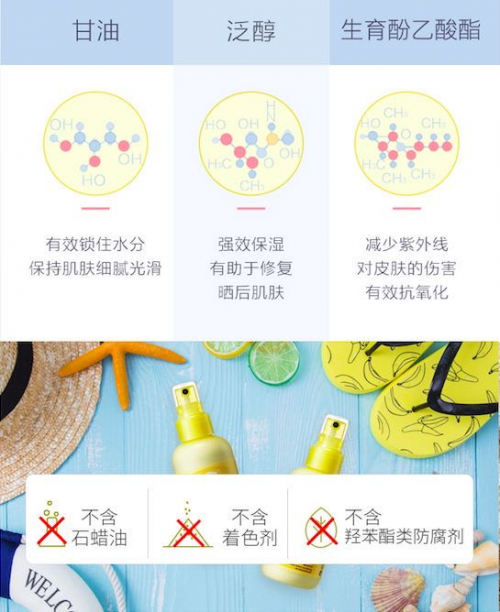 蕴含甘油、泛醇、生育酚等天然保湿成分,触感水润,防晒同时保湿肌肤,并有助于晒后肌肤修复和减少紫外线对皮肤的伤害。