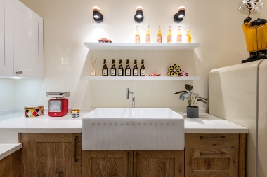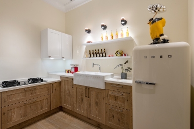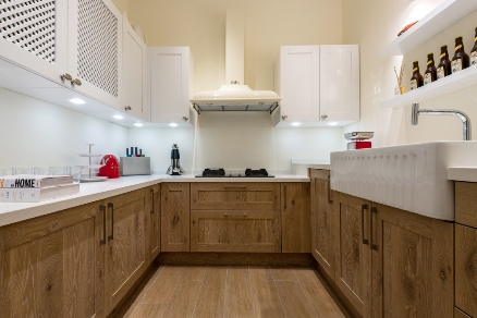 该系列同样对经典“古承”橱柜进行再“设计”,以简约取代原来柜门的繁复罗马雕花,让整体风格更加轻盈和平易近人。橱柜表面手工的做旧设计,都代表着岁月的记忆,仿佛记录着厨房里的每一次欢笑、离别、疯狂与温情。此外,橱柜墙面实木墙板拼接装饰,一块块独立木板以榫卯结构拼接,更便于维护和打理。