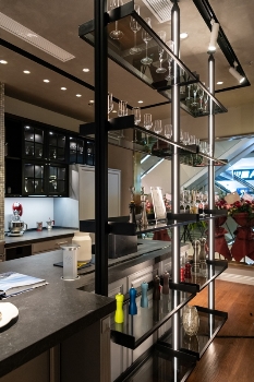 美式工业风的简约设计赋予厨房年轻与活力。中岛旁顶天立地的玻璃展示架采用智能感应的自动调光系统,随时为你而开,充满人性化、智能化色彩。
