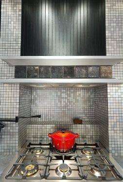 操作台一侧采用意大利进口炉灶,以更高的燃烧效率提升下厨速度;其下方的嵌入式烤箱配备转架和耐高温的橡胶探针,轻松烹饪大师级水准的食物。灶台上方马赛克拼接的墙体采用凸起设计,提供陈列空间,让大厨在烹饪时自由抓取器具和调料;右侧的宽敞操作台,则为美食创作提供充足空间。