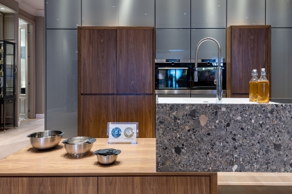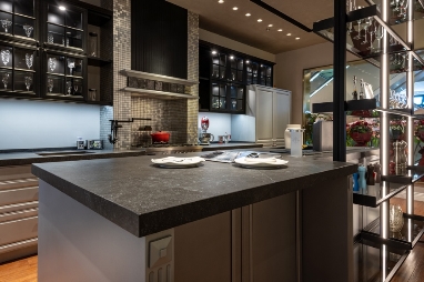 作为一个烹饪大师心中的梦想厨房,该系列从设计到设备都满足一个专业厨房的要求。中岛台面采用岩板材质,抗高温、耐划,可以直接作为料理台,用喷枪在上面烤制一道美味的三文鱼。