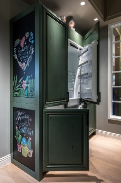 为了保持整个厨房空间色调风格的一致性,该系列特别设计了一个双开门隐藏嵌入式冰箱,在提升美感的同时做到生熟食材分区存放。柜体侧面的吸铁石黑板墙则提供了一个创意灵感区域,无论是孩子的粉笔画还是记录你旅行足迹的纪念吸铁石,都为厨房增添丰富生活色彩。