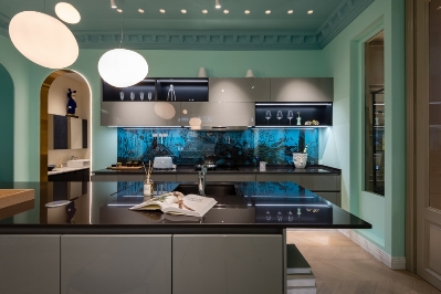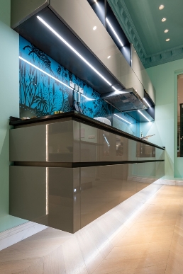 在这里,一切关于厨房的设计和幻想几乎都成为了现实。厨房背部由法国著名设计师Christian Liagre设计的壁纸被巧妙嵌入玻璃板中,丝毫无需担心油污问题,玻璃杯般的嵌入设计让你天马行空的艺术细胞能在厨房自由发挥。同镜子般光亮的极光黑岩板让厨房中岛尽显简约时尚,其延伸出底座的设计亦提升了整个空间艺术纵深感。