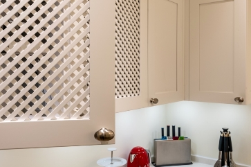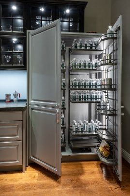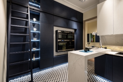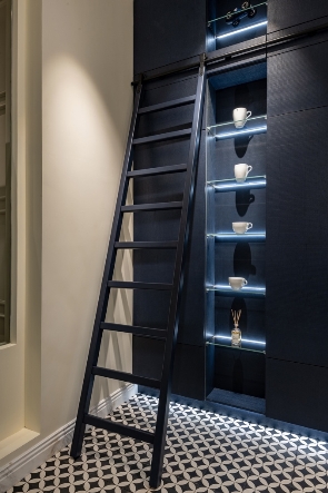 同时橱柜配备了一个可左右滑动的梯子,让人伸手可及橱柜任意角落。