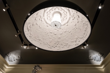搭配了荷兰工业设计鬼才马塞尔·万德斯(Marcel Wanders)的代表性灯饰作品Sky Garden系列。他根植于人文主义视角的设计,基于原型却摆脱教条,总能引起人们的共鸣和惊喜。将石膏天花板设计放在灯罩内的Sky Garden,让灯变身为一个秘密花园,与吊顶的石膏花纹在细节上呼应,以隐藏的细节为厨房空间带来意想不到的惊喜和独特韵味。