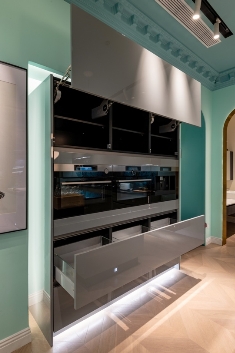 在视觉满足之外,其科技性能也令人称叹。流畅的奥地利电动控制系统让每一扇柜门和抽屉都轻松掌控于指尖,收拉自如。其按压式弹出的电动设计,让用户在双手被占用的情况下,也能轻松借助身体其他部位轻抵柜门、控制开合。
