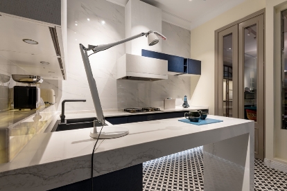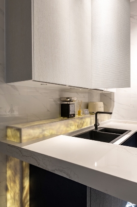 在空间规划上,设计师利用上浅下深的配色,和玉石材质的发光背景墙面,赋予厨房空间极强的延伸感与高级格调。除视觉延伸作用,这面发光背景墙还将操作台宽度向外增加22公分,保持用户在使用水槽和操作台时视线和采光的通畅,不受上方橱柜干扰;墙体的凸起设计,在操作台上方提供额外物品陈列空间,让厨房用品摆放一目了然、触手可及。