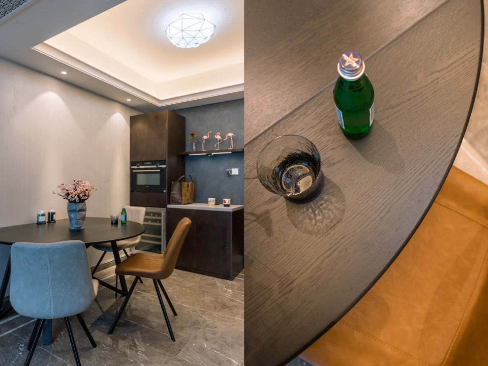回望紧邻厨房的餐区,圆餐桌面宛如局部露出的树木纹理,搭配内嵌烤箱结的合柜,吊顶暗藏灯透出的暖黄光线,一同点亮温馨的餐食风光。