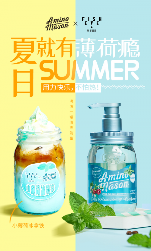 日系洗发水火遍娱乐圈的品牌Amino Mason ,于6月9日以“夏日就有薄荷瘾”为主题,跨界联合FISHEYE鱼眼咖啡,为今夏打造薄荷限定的清凉体验,在炎热的季节享受从头到脚、由内到外的酷爽~