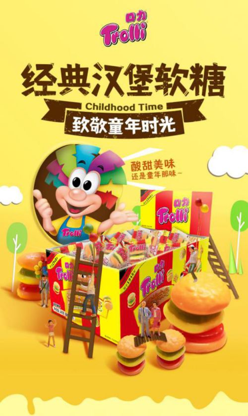 随着时代变迁,社会飞速发展,物质生活极大丰富,“汉堡橡皮糖”不再是人们不舍得吃的糖果,各式各样的糖果、巧克力、进口零食琳琅满目,人们已有了更多的选择。Trolli口力与时俱进,不断推陈出新,致力于研发和生产健康0脂肪、真正的鲜果果汁添加,特有德国风味的凝胶糖果,同时形趣兼备,造型新颖,好吃又有趣。不仅仅小朋友爱不释手,也备受现代年轻人的喜爱,成为了现代白领日常办公必备零食之一。