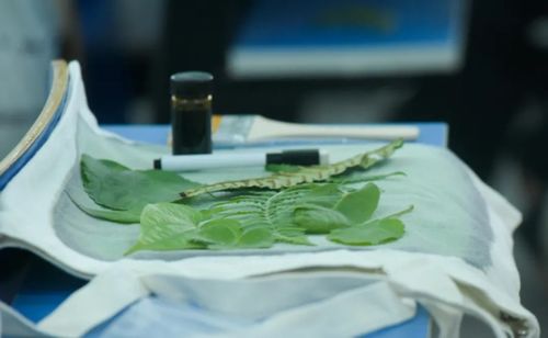 然后,领队老师将晒蓝公益和自然教育课完美融合:每一位同学可以选取自己喜欢的叶子,制作自己专属个性的帆布包。
