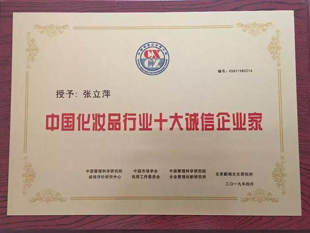 在新时代新中国诚信标杆企业家宣传表彰活动中,奢脉国际凭借在化妆品领域的管理创新和坚持品质的恒心荣获中国“重质量 守诚信 好品牌”示范企业称号。并提名董事长张立萍先生为“中国化妆品行业十大诚信企业家”。