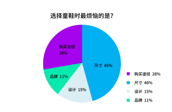 46%的妈妈纠结于童鞋的尺寸问题,其次是购买途径、设计和品牌。