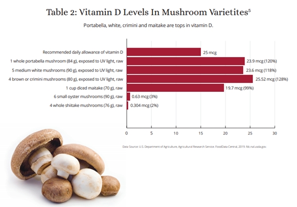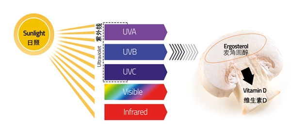 蘑菇是少数含有麦角固醇(维生素D2的前体)的食物。学术研究表明,种植者可以通过将蘑菇暴露在紫外线(UV)下来显著提升维生素D水平。 与人类相似,蘑菇在暴露于阳光或日光下自然会产生维生素D,蘑菇的植物固醇-麦角固醇-暴露于光线下会转化为维生素D。