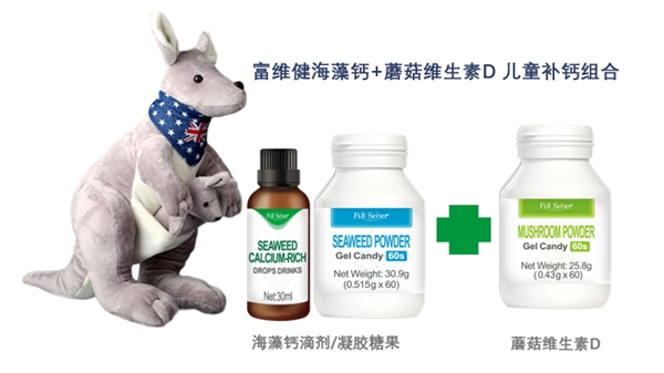 (图为:富维健儿童补钙黄金组合--海藻钙+蘑菇维生素D)