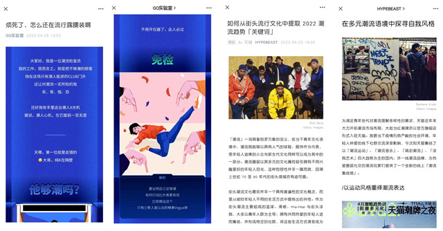 随后,他们又携手国际知名潮流媒体Hypebeast,共同发布潮流运动、潮流音乐、高街潮流与涂鸦艺术四大流行趋势并作详细阐释,直接面向潮流圈层做深度沟通;并在同期与GQ联合推出图文内容《烦死了,怎么还在流行露腰装啊》,以SVG化的“潮流安检”形式搭配检测“潮度”的趣味表达,引导搜索站内小程序、邀请大家齐聚「天猫潮牌之夜」。