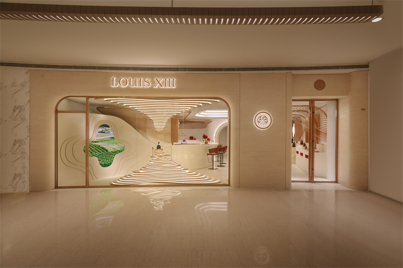 环绕店铺的“律之光翼”金属装置,意在表达穿越时空的体验,螺旋式的设计自然交融,通过对生命之水流动性的美学诠释,让宾客沉浸在路易十三的传奇之旅中。整个空间的灵感来自于路易十三代代传承的手工和巧思之艺,呈现出流动的韵律感,光影变幻与灵动空间相映成辉。