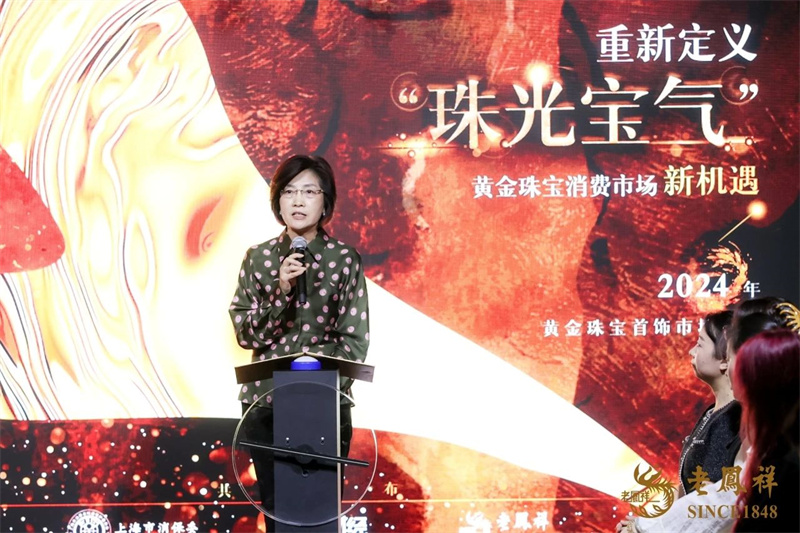 发布会上,上海市消费者权益保护委员会秘书长、上海市市场监督管理局二级巡视员陶爱莲,联同第一财经总编辑杨宇东和老凤祥股份有限公司党委书记、董事长杨奕共同重磅发布《2024年黄金珠宝首饰市场消费新洞察》。