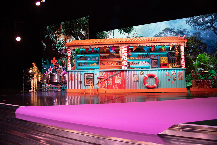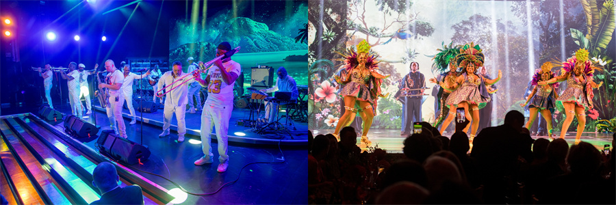 蒙特卡洛星际大厅(Salle des Etoiles)的入口被设计师打造成一片风格鲜明的热带日落森林,并借由一条小径唤起宾客对加勒比日落时分温暖夜晚的回忆。舞台上的装饰更是令人惊艳,一座由经过海水和阳光风化的木板制成的标志性吧台矗立于此,向宾客发出派对和狂欢的邀请。吧台的装饰就像一个剪贴画:棕榈树、郁郁葱葱的热带森林、标牌、果汁车和象征加勒比海的遮阳伞混合在一起,背景板上装有视频映射,让海滩装饰栩栩如生,并随着夕阳西下而熠熠生辉。