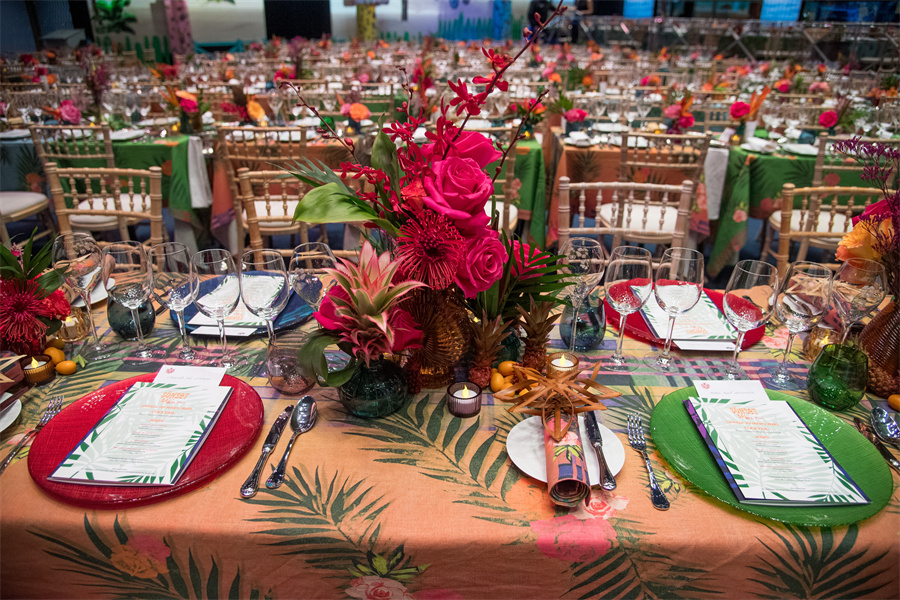 色彩缤纷的桌布印有马德拉斯、玫瑰和异国情调的棕榈树图案。鲜花则以玫瑰和异国情调的花朵为主,点缀着颜色各异的花瓶。