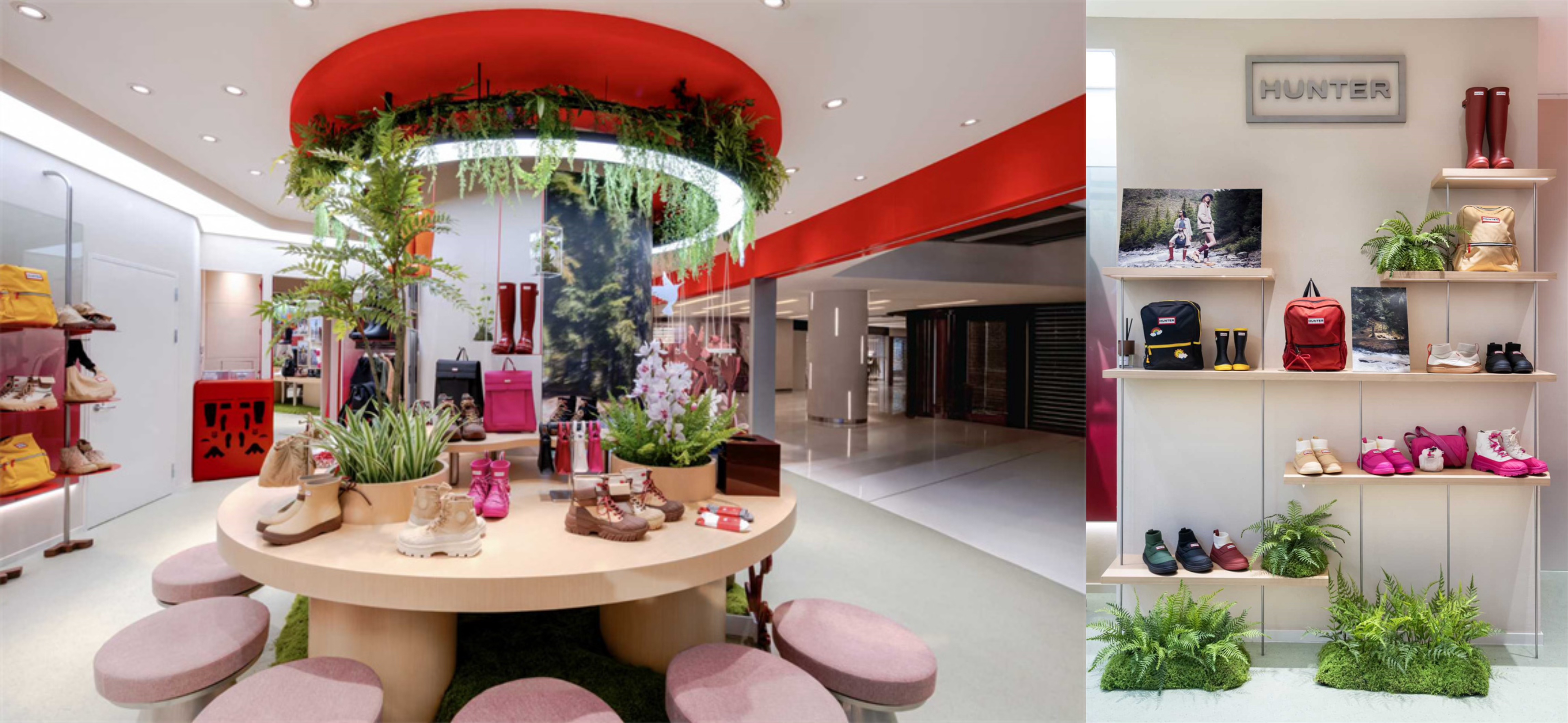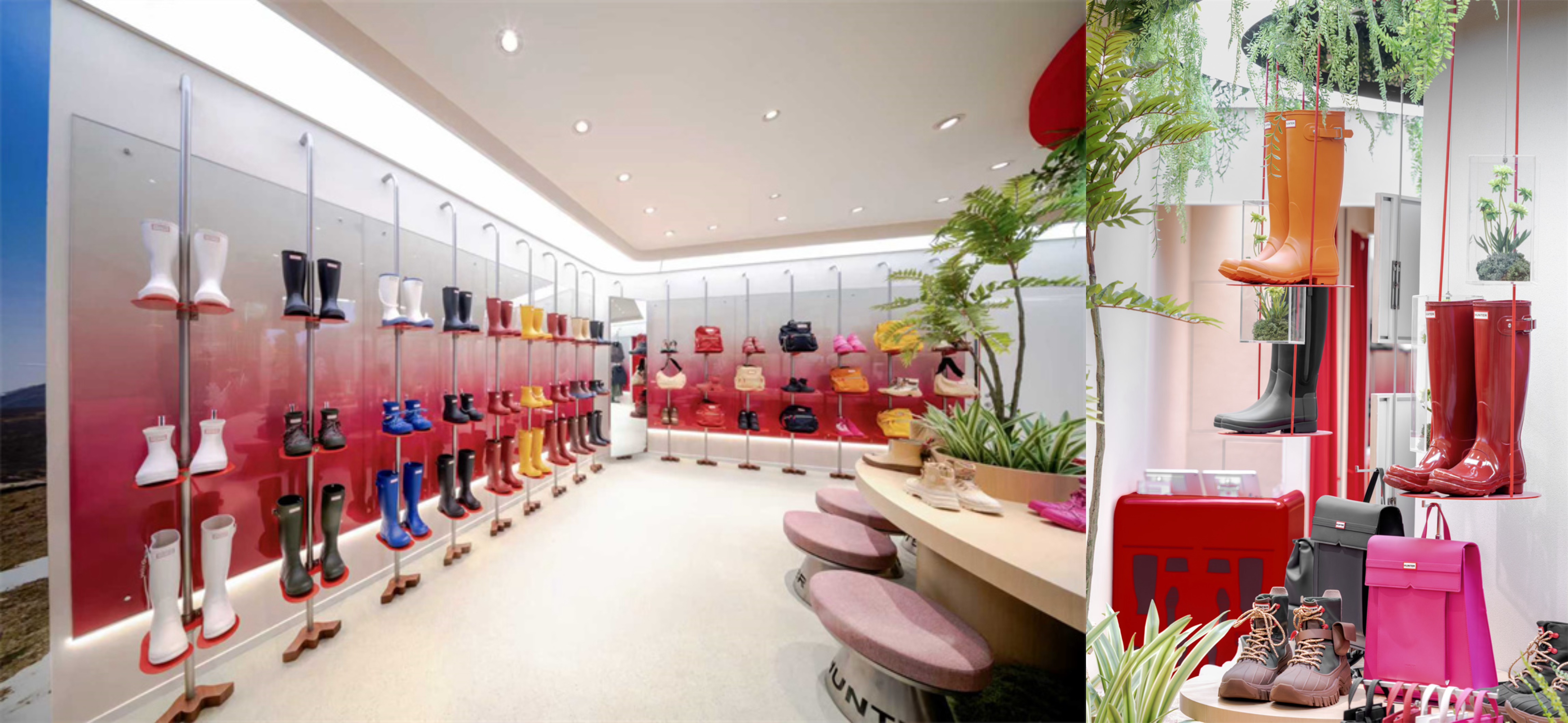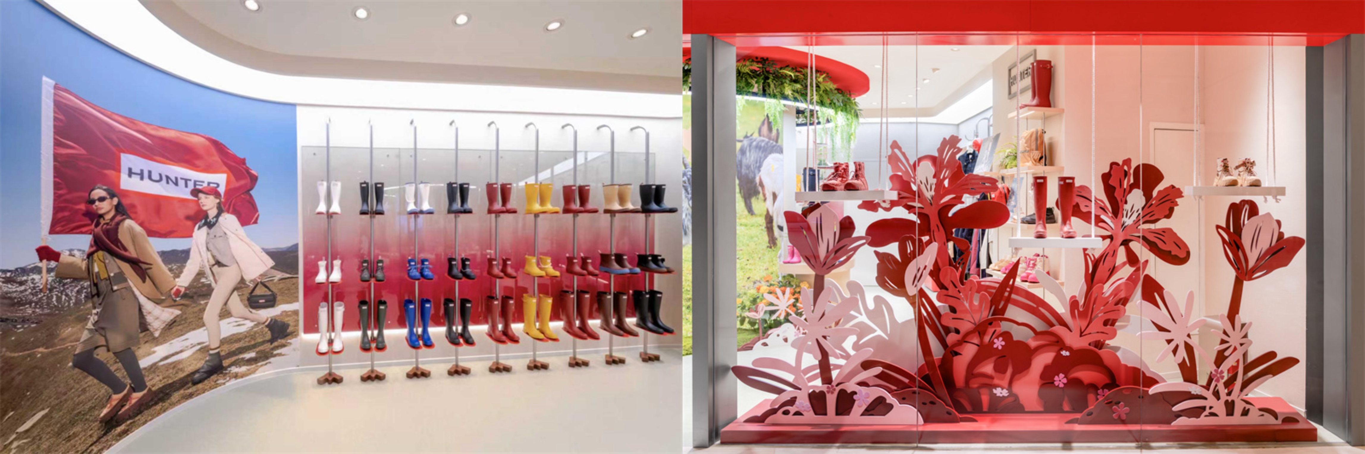 HUNTER上海环贸iapm店坐落于商场核心区域,以鲜明夺目的品牌色调呈现。店铺入口右侧呈现艺术家温秋雯为HUNTER特别创作的纸雕艺术橱窗,其以精巧细腻的纸雕工艺,将HUNTER 2025秋冬猎鸭靴系列产品融于自然意象之中,在都市中心构筑出一幅自然与艺术交融的画面。店内不锈钢船型装置以流畅的线条演绎探索精神,与创新架构的雨靴墙相得益彰,共同诠释品牌经典与现代美学的融合。这些设计元素赋予HUNTER城市公园盎然生机,无论肆意奔跑或是漫步其间,都生动诠释都市与自然联结的品牌理念。