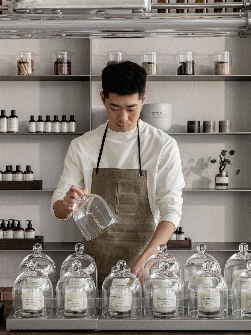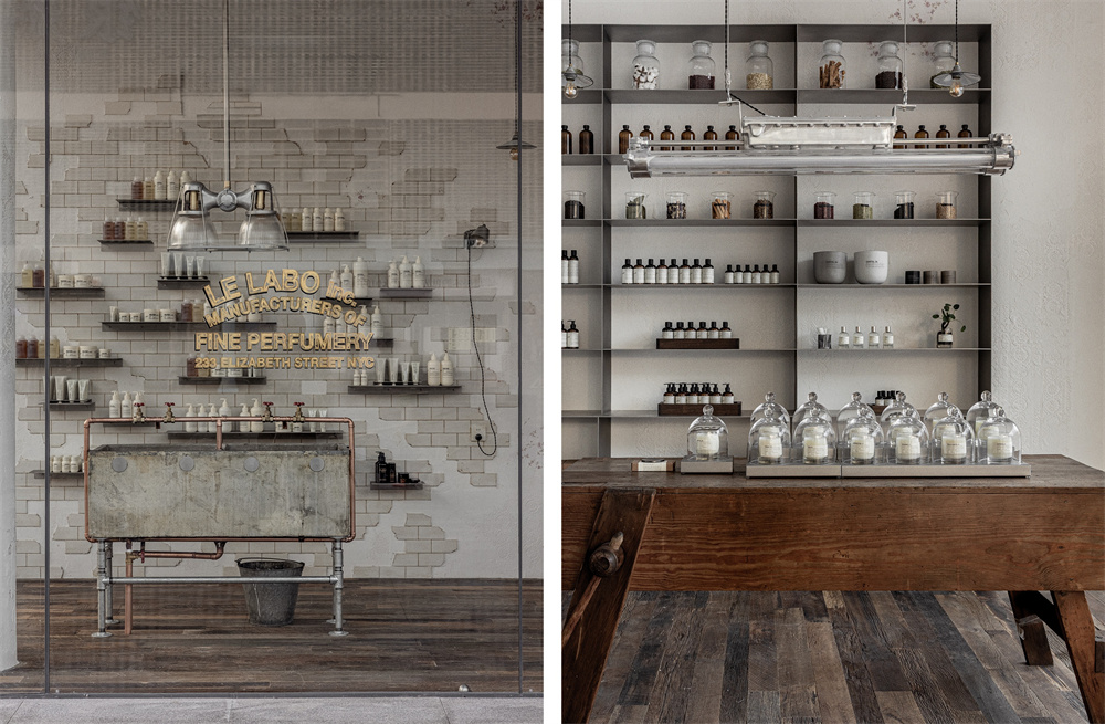 全新香氛实验室位于杭州湖滨银泰in77,不同于以往香氛实验室的设计体系,以明亮开阔,具有呼吸感的现代质感,回应杭州的包容与淡雅。外立面与内部陈列架均采用复古浅色金属材质,搭配通透落地窗;特别引入混凝土材质水槽,并采用白色艺术涂料及手工砖打造复古墙面,粗粝质感呼应标志性侘寂之美,与现代风格达成微妙平衡;漫步其间,经典香氛、香氛身体、家居香氛、全身护理与复古理容系列作品悉数陈列于中古家具之上。