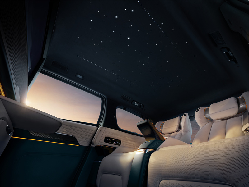 图:流光星瀚穹顶营造超越想象的浪漫情境 四座私享版还带来在顶级豪车中也非常罕见的流光星瀚穹顶,提供八大星空模式选择,通过散布在麂皮顶衬上的528个明暗交替星点,模拟出璀璨逼真的星空效果。辅以山水鎏银真木饰件、麦穗纹绗缝纹理等专属内饰设计,通过“有温度”的科技以及手工限量定制,打造出安顿身心、滋养心灵的超然意境,尽显名仕风雅。